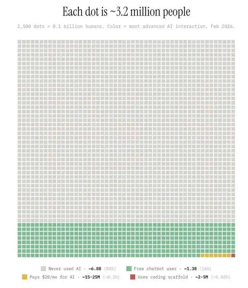 据X上发布的一张图片显示数据,全球81亿人中,有84%的人,即68亿人从未用过AI,而只有0.3%,即1500万到2500万人的用户愿意为AI付费。有16%的13亿人用过免费聊天机器人。