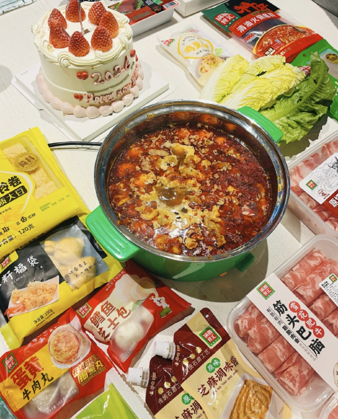她发现,就在她老家所在的几百米外,就有一家锅圈食汇,她于是将之加入收藏,并在春节期间直接去逛和定外送。她清楚地知道自己要点什么,川渝招牌牛肉自由火锅,羊蝎子火锅,是她在北京时的最爱,而今年春节,她将自己平时最爱的食物做给爸妈吃,用相同的食物宽慰他们的离别。